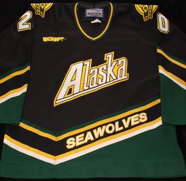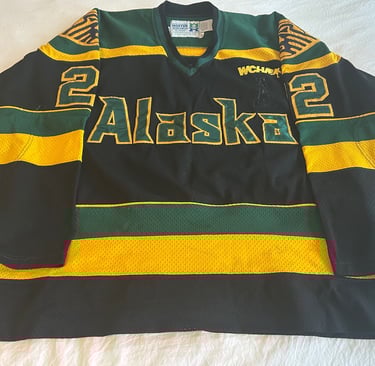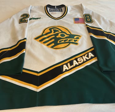 1991 - 1994 - Mitch Kean - Hooters mesh, no name on the back, captains "C" has been removed, was ironed on at some point, the WCHA logo has been embroidered and the shoulder patches are sewn on