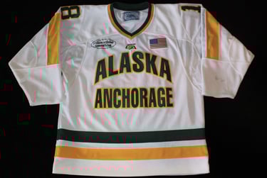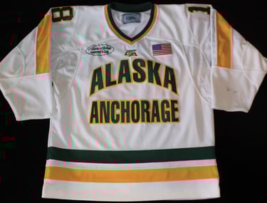 White Gemini mesh, UAA script on the shoulder and names on the back, WCHA is embroidered on the back hem of the jersey