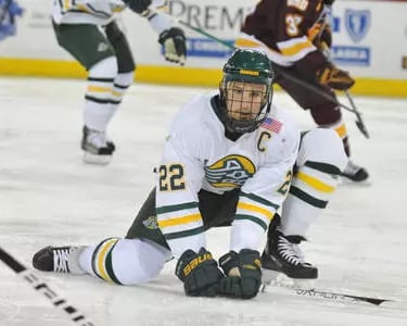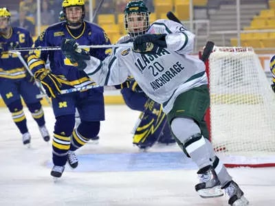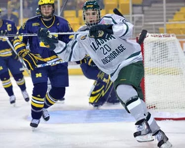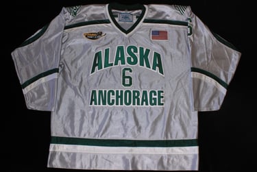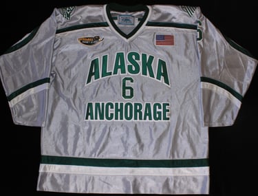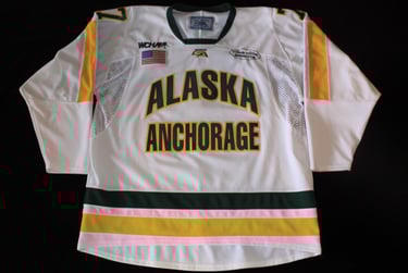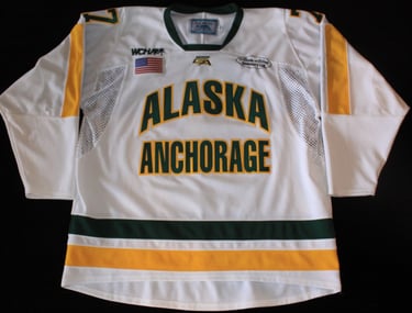 White Gemini knit, UAA script on the shoulder and names on the back, WCHA is embroidered on the back hem of the jersey
