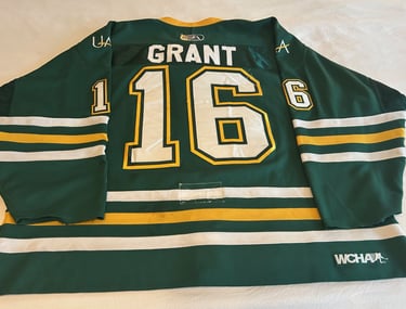 Green Gemini knit, WCHA is embroidered on the back hem of the jersey and the GA logo is under the back collar