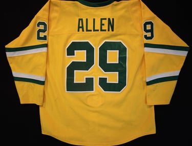 Gemini off white alternate knit, names on the back, Kendall Hockey Classic patch on the chest, WCHA shield is in the neckline.